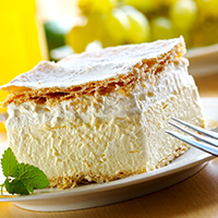 Traditional cheesecake topped with toffee and chocolate served with vanilla cream